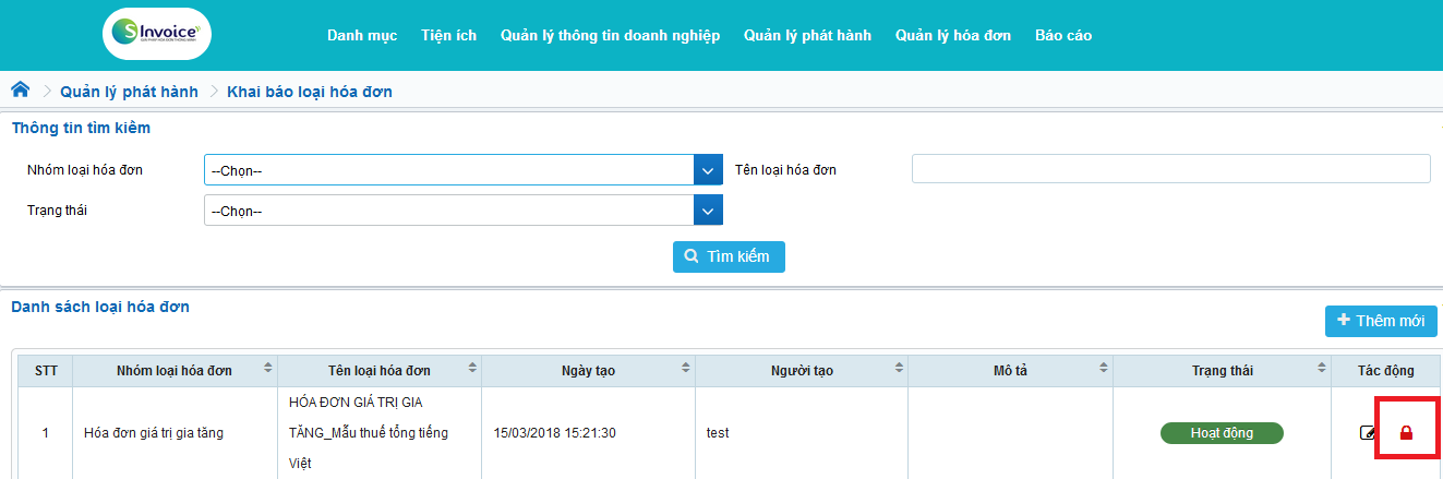 - Sau khi tìm kiếm, trên gird danh sách loại hóa đơn, click chọn bản ghi muốn khóa