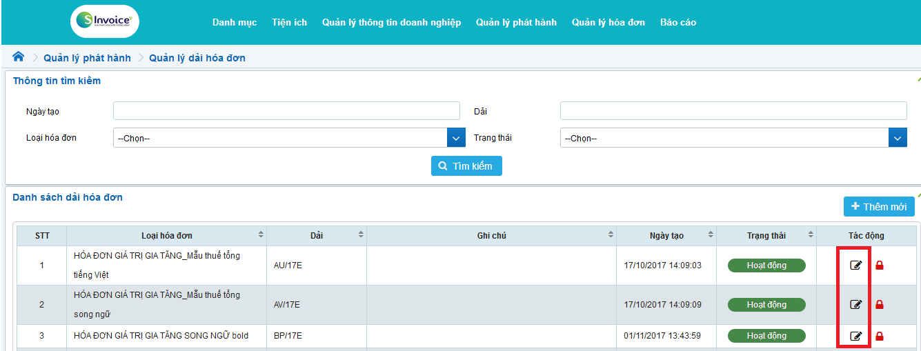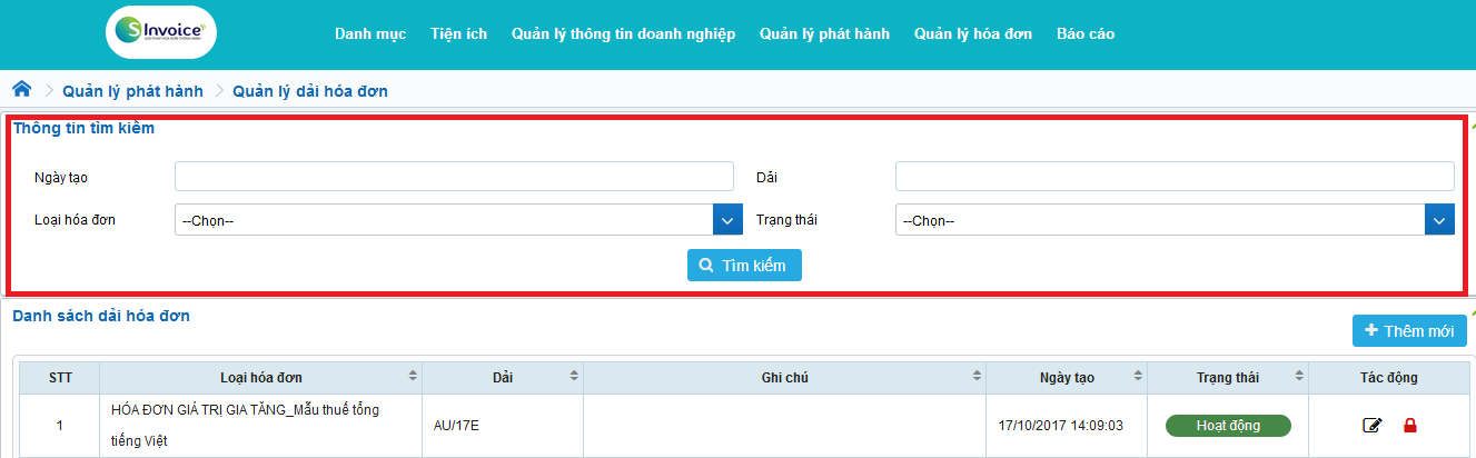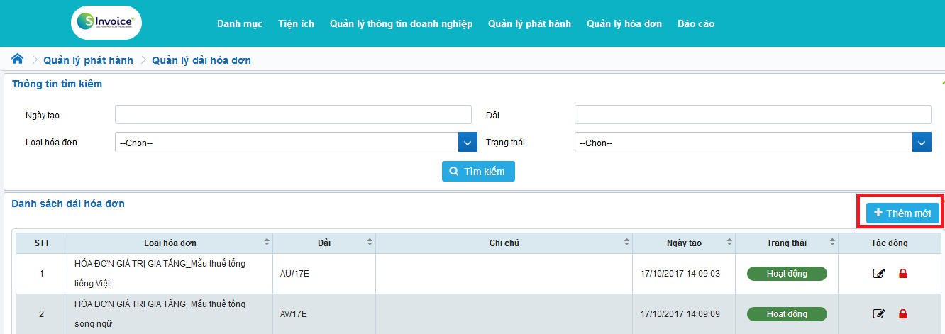 Bước 1: Tại màn hình chức năng Quản lý dải hóa đơn