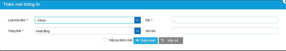 Bước 1: Tại màn hình Quản lý dải hóa đơn, click button Thêm mới