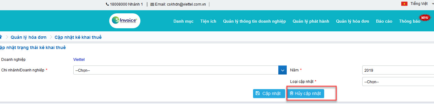 Trường hợp cập nhật kê khai thuế nhầm, người dùng có thể chọn Hủy cập nhật với tháng/quý tương ứng để quay lại trạng thái chưa kê khai thuế