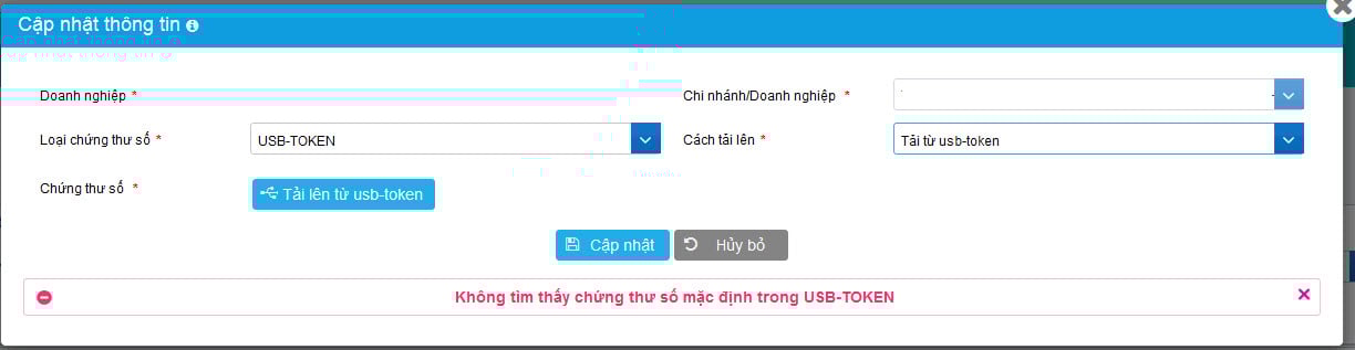 1. Khi lập hóa đơn/phát hành hóa đơn/thêm mới chứng thư số, hệ thống hiển thị thông báo lỗi:"Không tìm thấy chứng thư số mặc định trong USB-TOKEN"