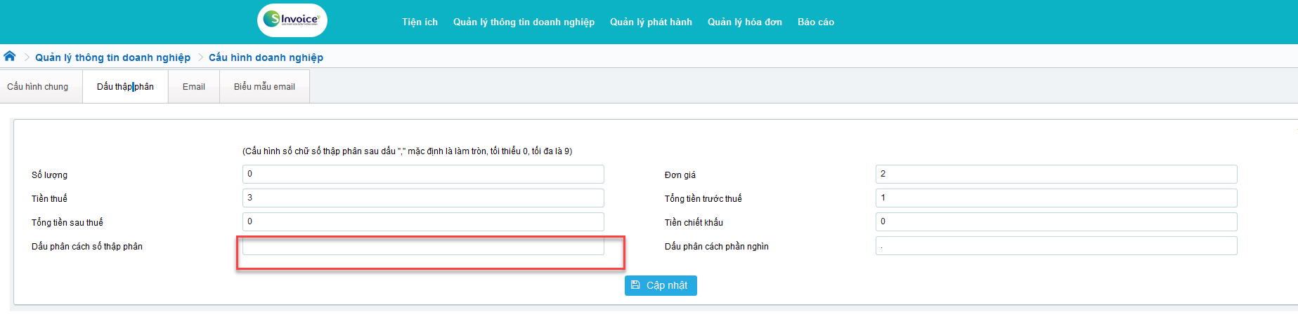 1. Vào Cấu hình doanh nghiệp-> Cấu hình thập phân-> nhập dấu ',' cho Dấu phân cách số thập phân => Nhấn cập nhật