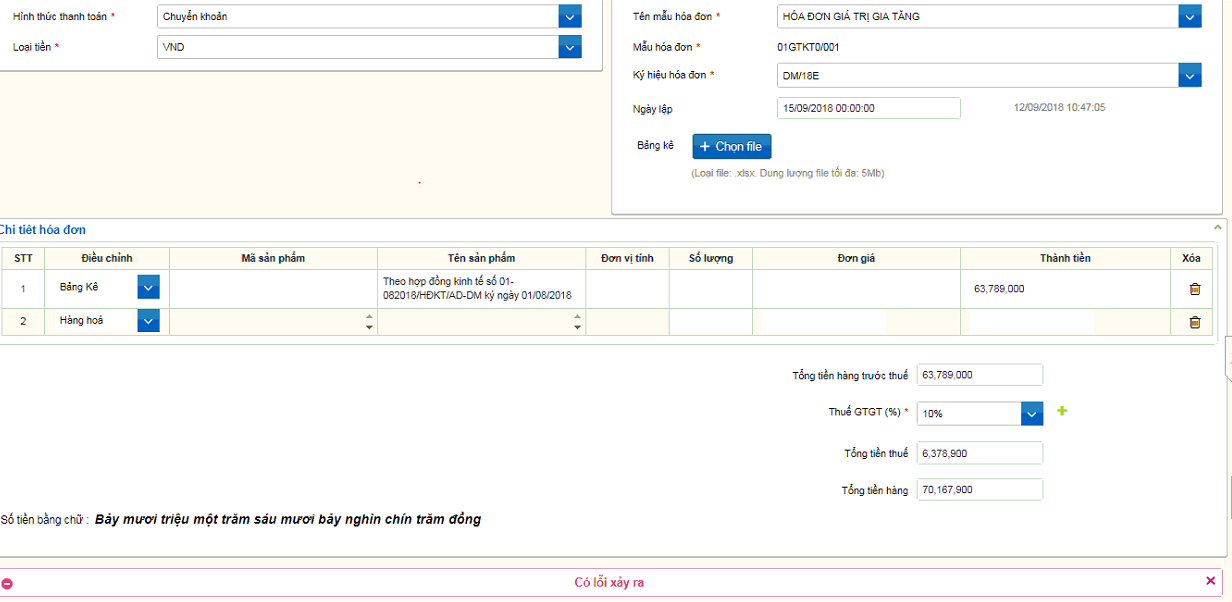 Lỗi 58: Lập hóa đơn, hệ thống báo :”Có lỗi xảy ra”