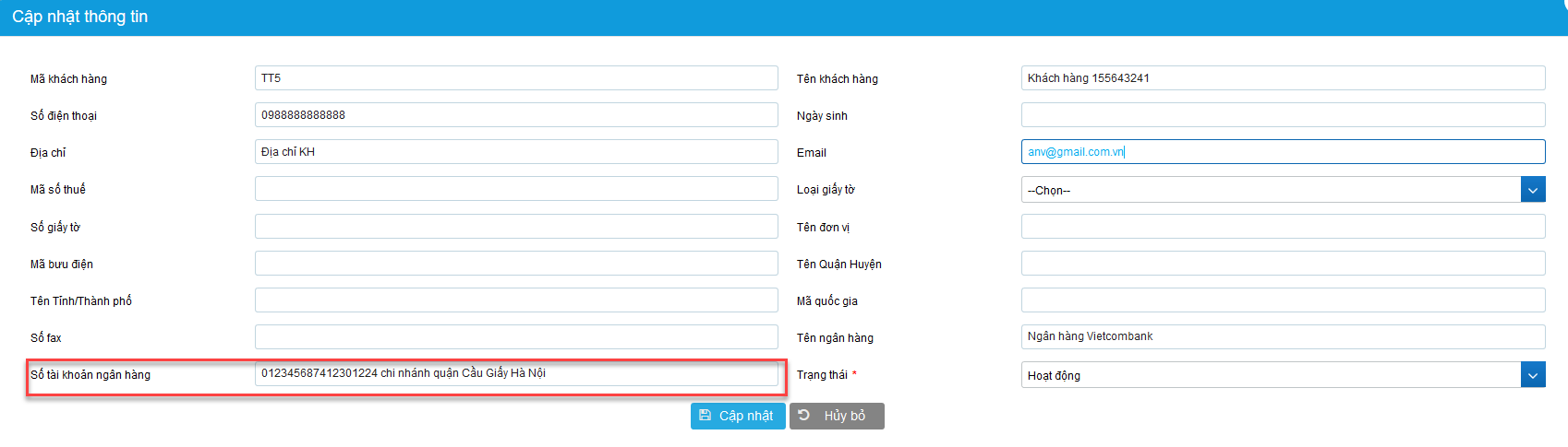 Sửa lại đúng dữ liệu tài khoản của một ngân hàng, chỉ có số, không có chữ để hệ thống Lập hóa đơn thành công