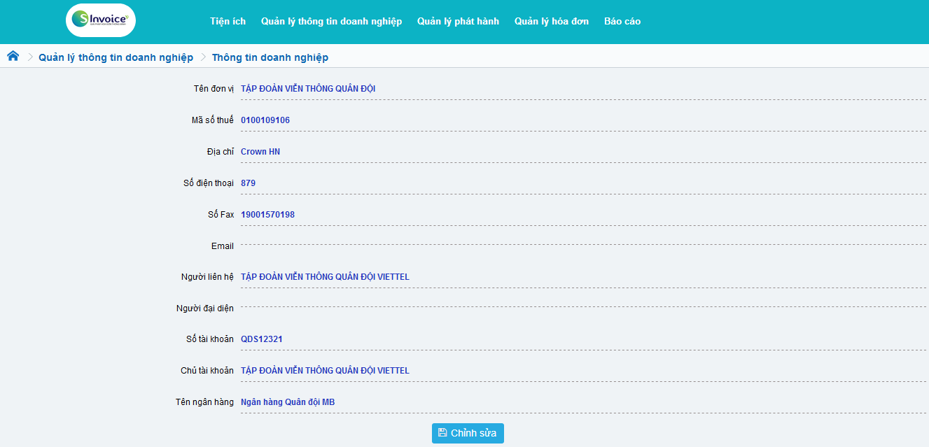 - Nếu doanh nghiệp chưa lập thông báo phát hành, doanh nghiệp vào Quản lý thông tin doanh nghiệp/Thông tin doanh nghiệp để tự sửa địa chỉ