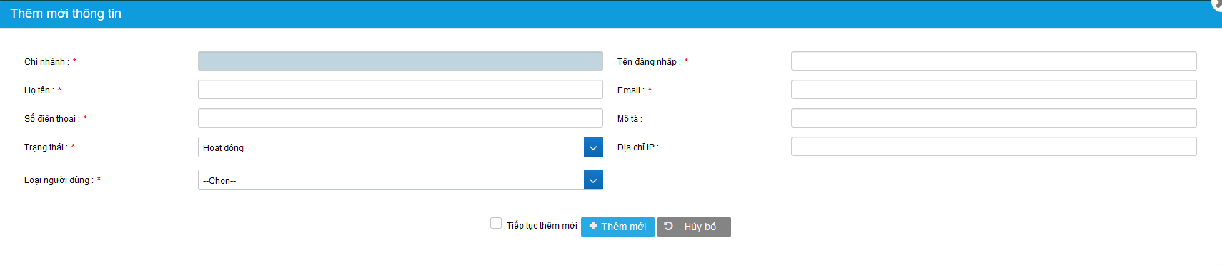 +) Thêm mới người dùng của chi nhánh tại giao diện Quản lý người dùng: