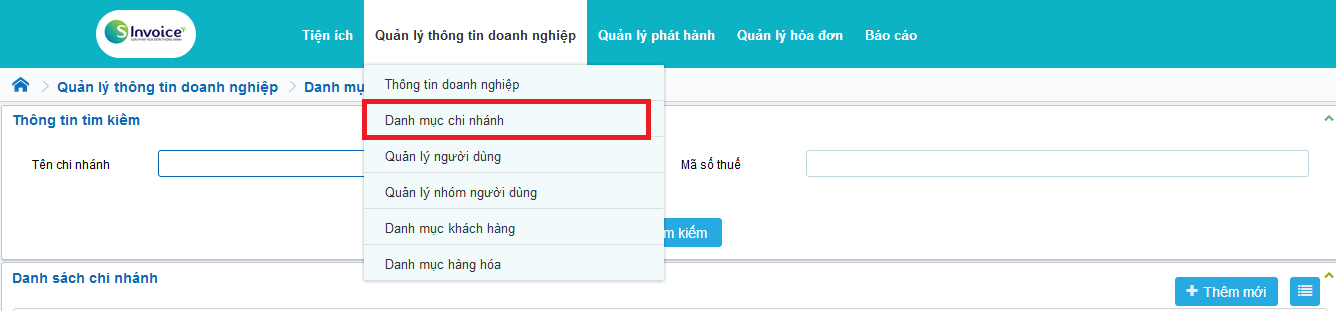 Người dùng vào chức năng Quản lý thông tin doanh nghiệp/Danh mục chi nhánh