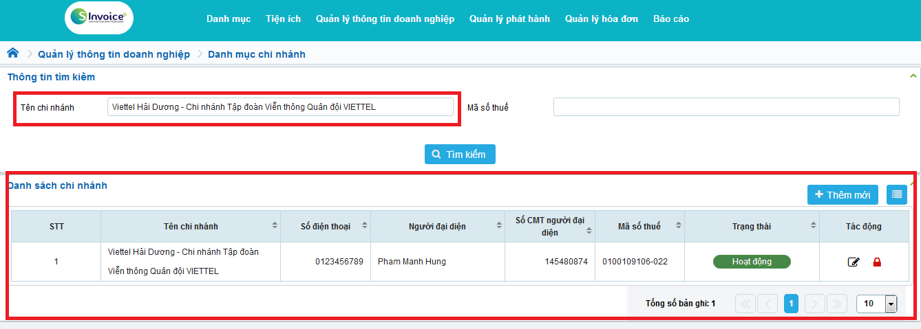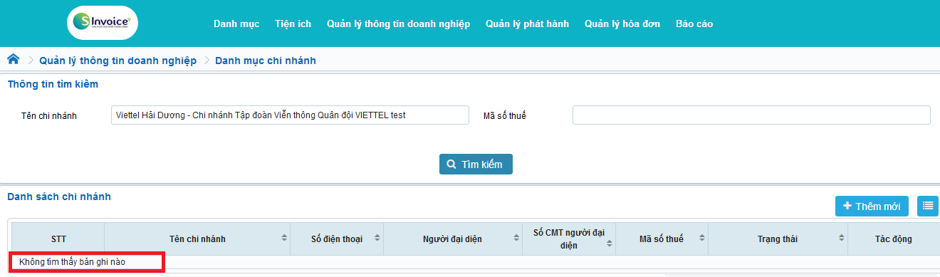 - Trường hợp chi nhánh không có mã số thuế, người dùng thực hiện tạo chi nhánh tại danh mục chi nhánh, không nhập thông tin mã số thuế, hệ thống sẽ mặc định lấy mã số thuế của công ty mẹ để chi nhánh lập hóa đơn