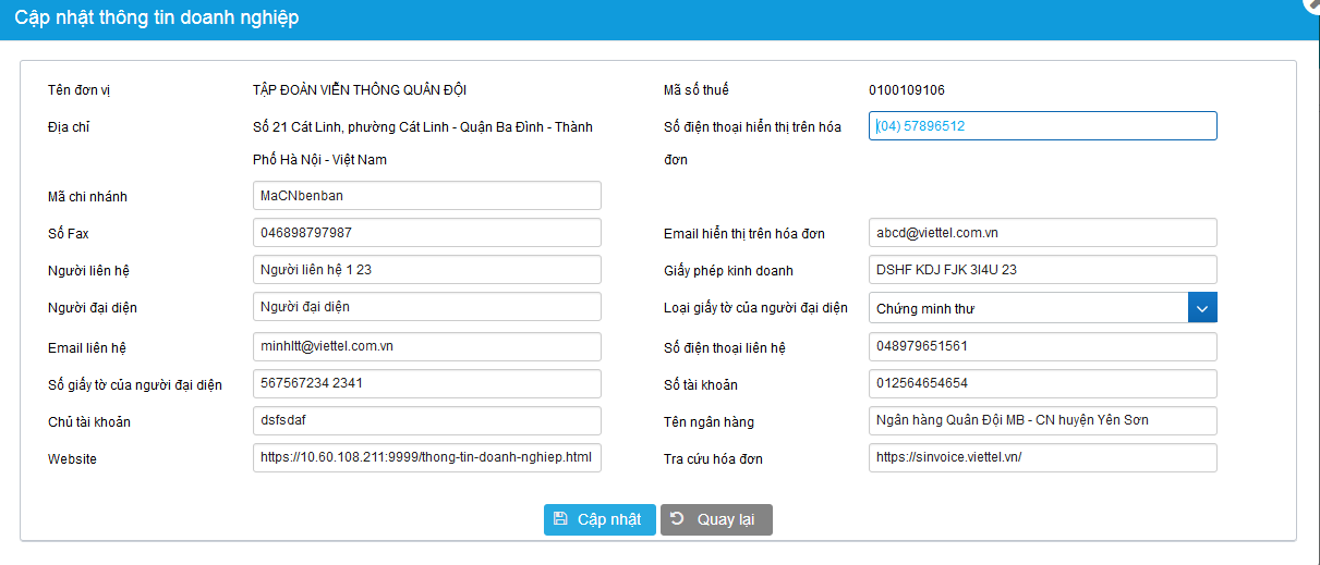 Bước 3: Cập nhật thông tin doanh nghiệp