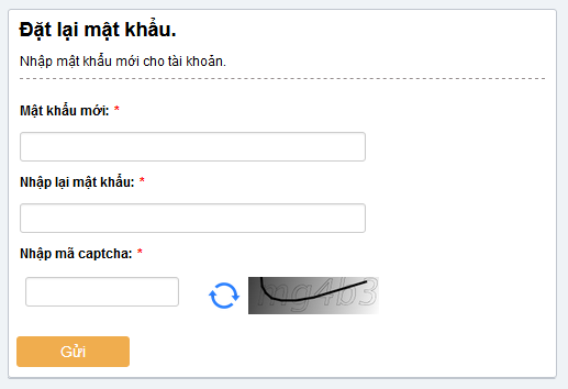 Bước 6: Người dùng nhập các thông tin mật khẩu mới à nhấn Gửi. Sau đó đăng nhập vào hệ thống bình thường với account và mật khẩu mới vừa reset.