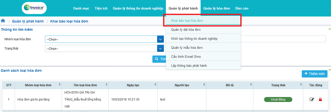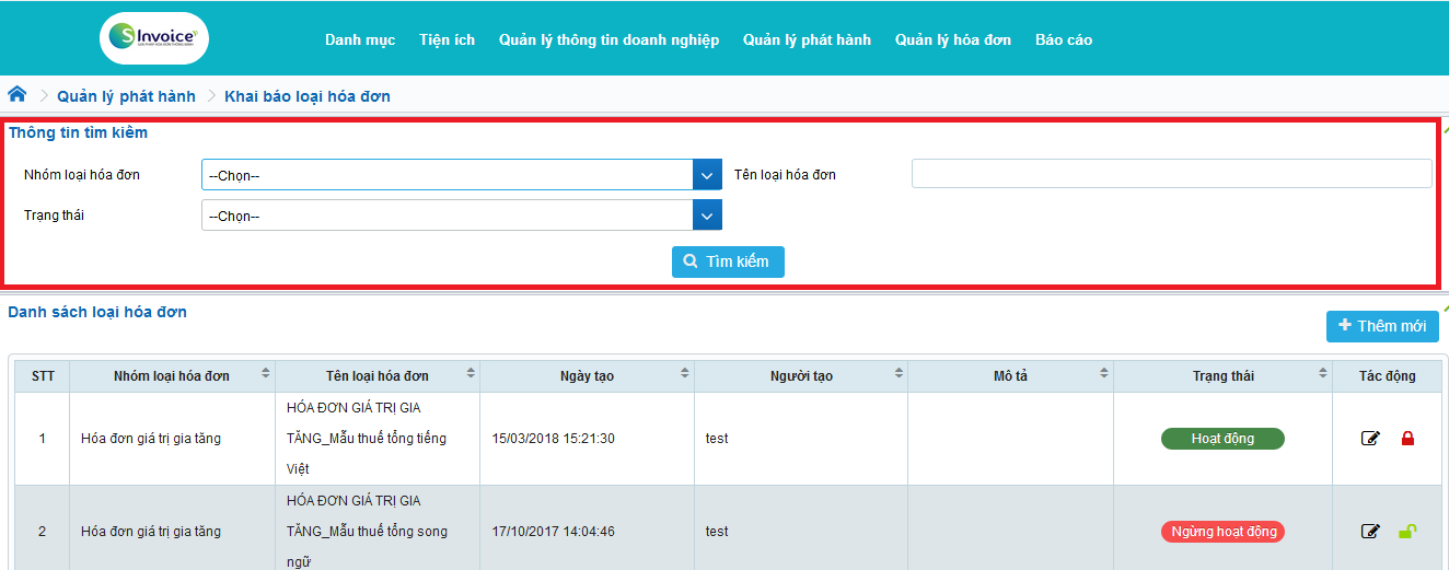 - Sau khi tìm kiếm, trên gird danh sách loại hóa đơn, click chọn bản ghi muốn khóa