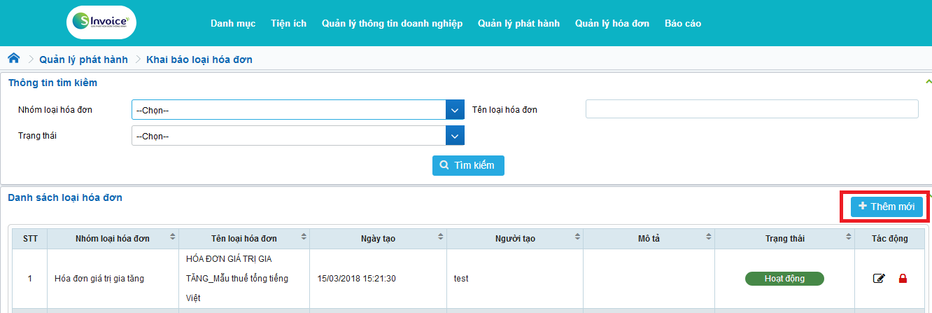 Bước 1: Tại màn hình Danh mục loại hóa đơn, click button Thêm mới