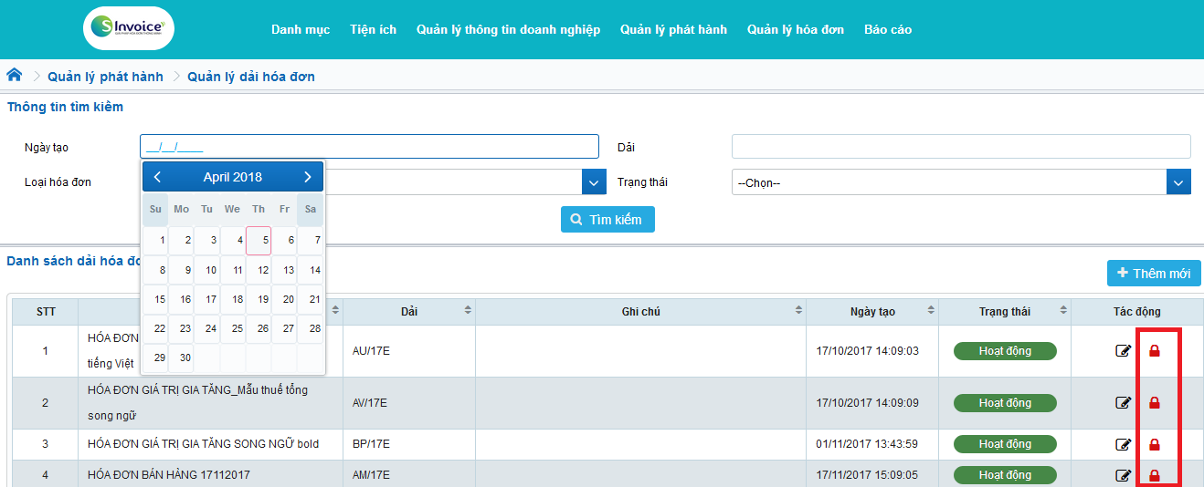 - Sau khi tìm kiếm, trên gird danh sách dải hóa đơn, click chọn bản ghi muốn khóa