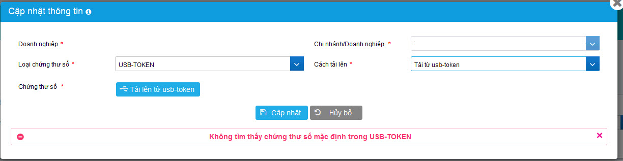1. Khi lập hóa đơn/phát hành hóa đơn/thêm mới chứng thư số, hệ thống hiển thị thông báo lỗi:"Không tìm thấy chứng thư số mặc định trong USB-TOKEN"