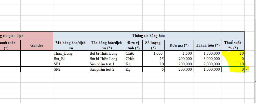 +) Hàng hóa không có đầy đủ thông tin: Tên sản phẩm/mã sản phẩm/Số lượng/Đơn giá/Thành tiền……