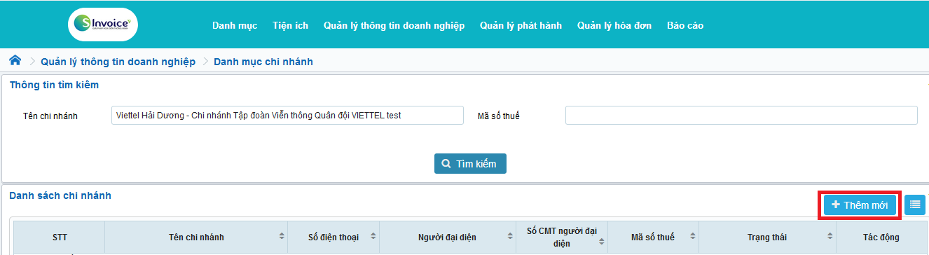 Người dùng vào chức năng Quản lý thông tin doanh nghiệp/Danh mục chi nhánh