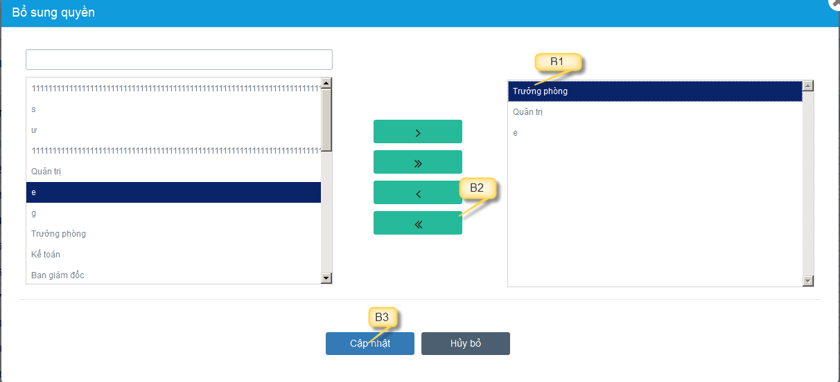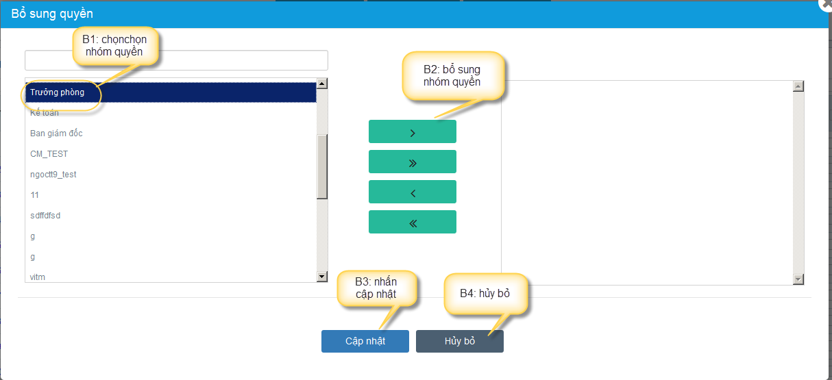 + Nhấn button “>” hoặc “>>” để bổ sung nhóm quyền cho người dùng