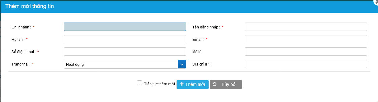 +) Thêm mới người dùng của chi nhánh tại giao diện Quản lý người dùng: