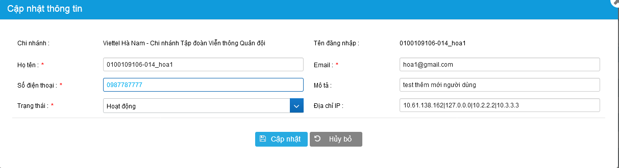 + Địa chỉ IP: người dùng nhập thông tin IP tĩnh của máy cá nhân sử dụng tài khoản đăng nhập vào hệ thống (thông tin IP giúp hệ thống của doanh nghiệp có thể kết nối đến webservice của Viettel)