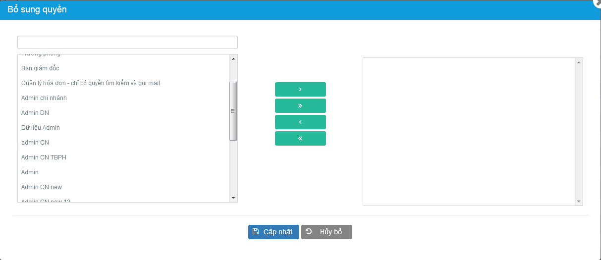 Bước 4: màn hình phân quyền mở ra cho phép quản trị tìm kiếm và chọn nhóm quyền để gán cho người dùng
