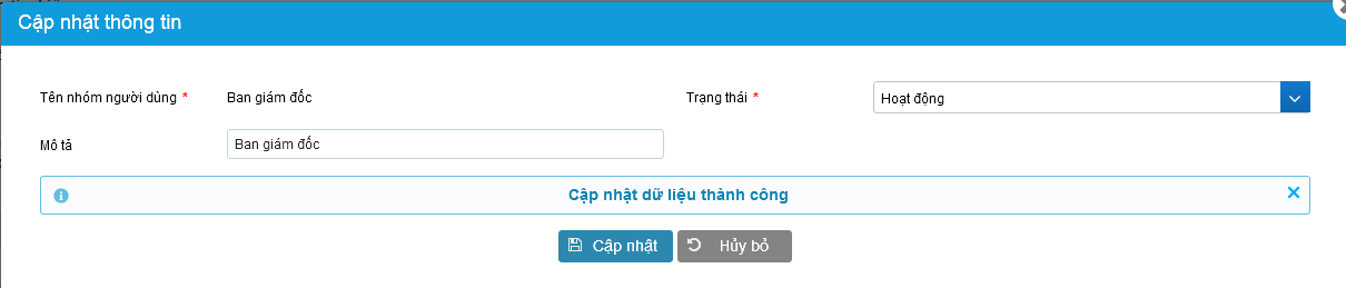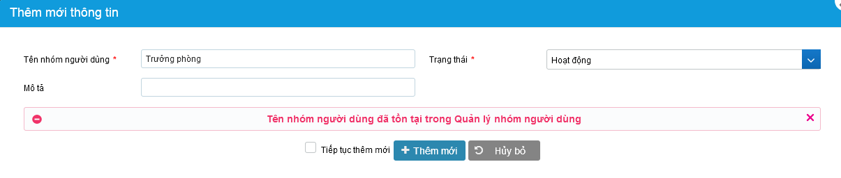 - Nếu nhóm người dùng đã tồn tại: hệ thống thông báo “Tên nhóm người dùng đã tồn tại trong Quản lý nhóm người dùng”