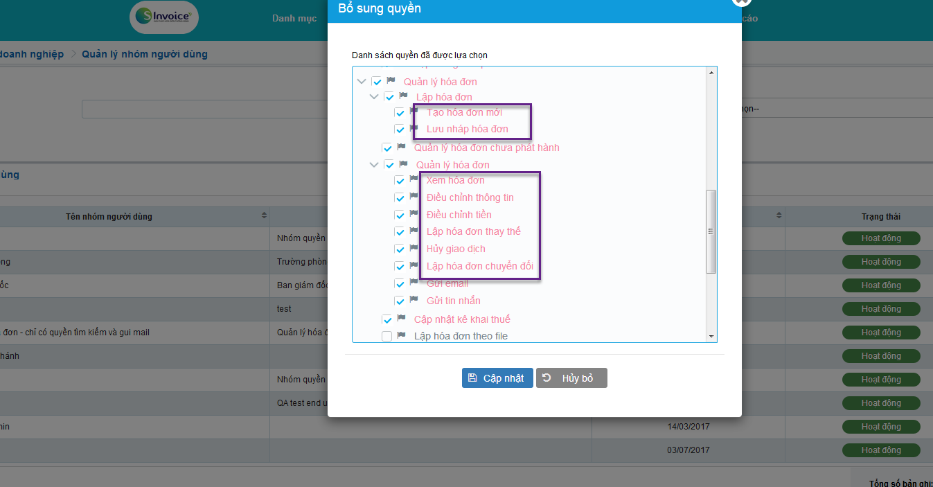 - Thêm các quyền con vào chức năng Quản lý hóa đơn gồm