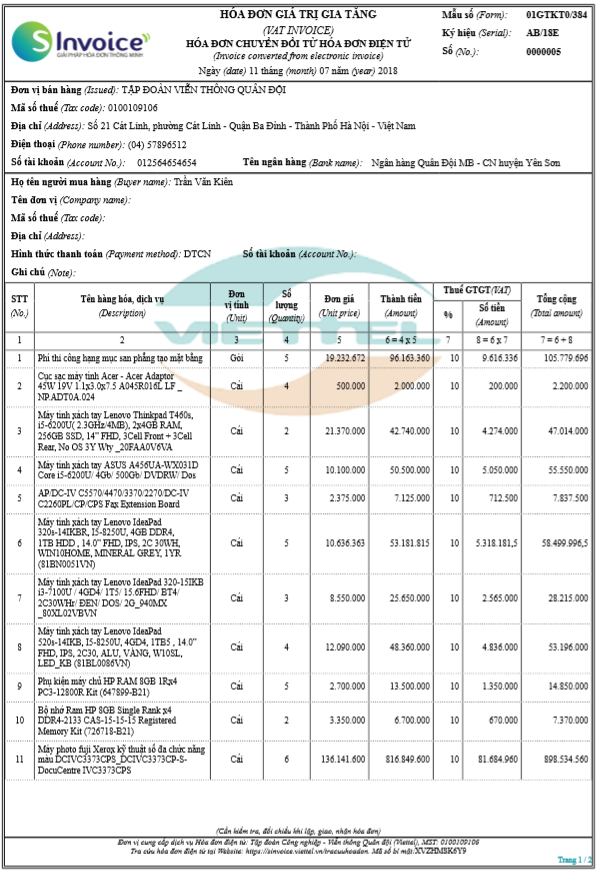 - Số hóa đơn đã mua: số lượng hóa đơn doanh nghiệp đã mua của Viettel