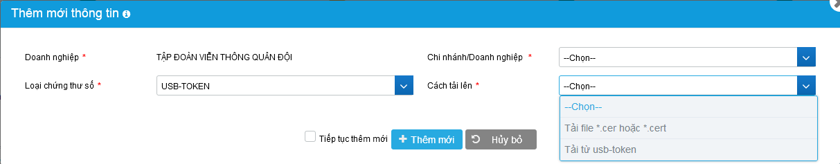 3. Chức năng Thêm mới thông tin chứng thư số - Nếu chọn Loại chứng thư số = USB-TOKEN