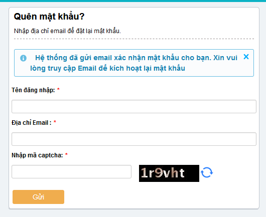 Bước 6: Người dùng nhập các thông tin mật khẩu mới à nhấn Gửi. Sau đó đăng nhập vào hệ thống bình thường với account và mật khẩu mới vừa reset.
