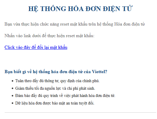 Màn hình email gửi link reset mật khẩu cho người dùng